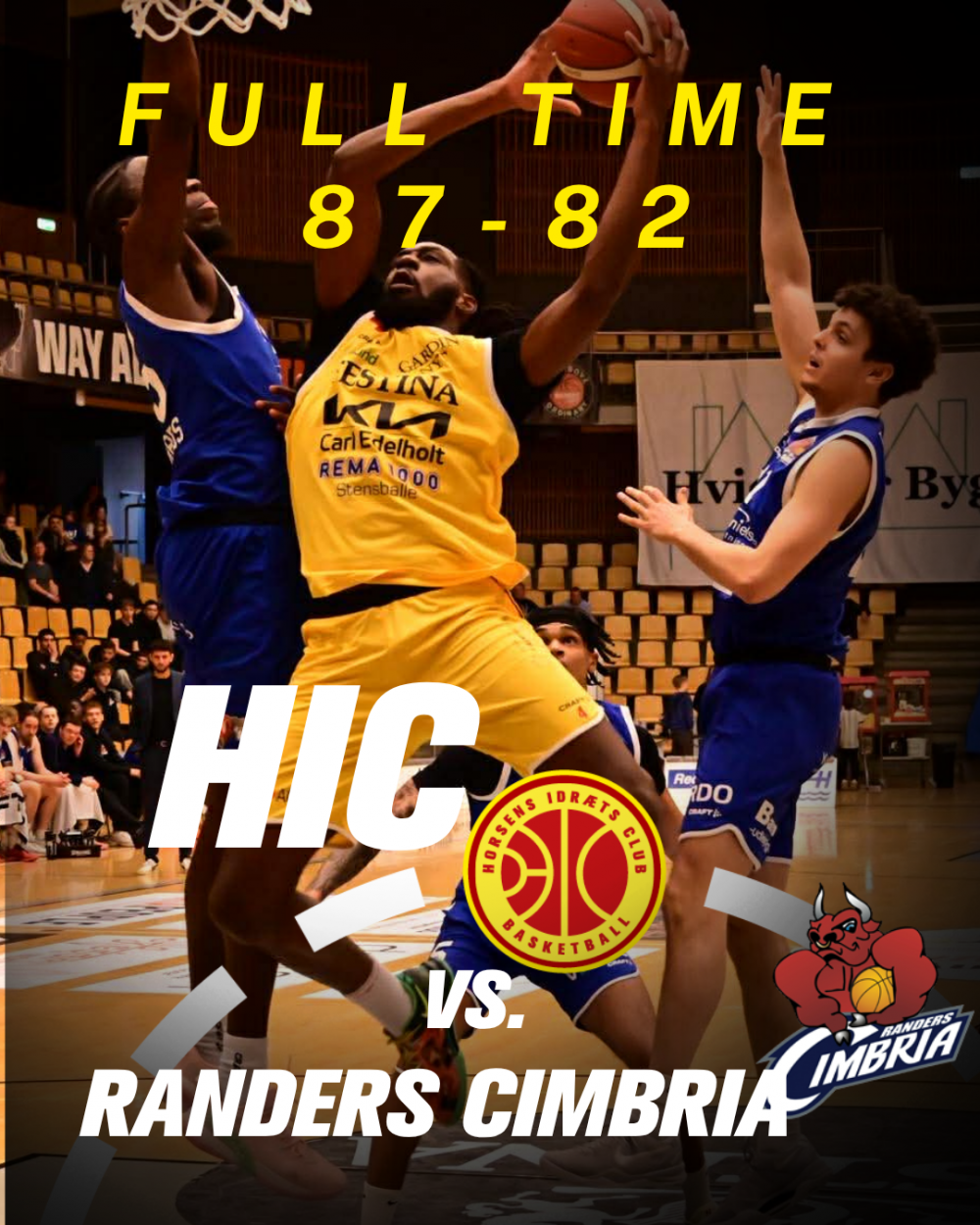 Her bliver det spændende da vi begynder at lade os stresse af Cimbrias presspil og smider bolden væk. Det giver en hurtig mulighed til Randers og bolden ender i hænderne på storskytten Bakir Serdaravic og han svigter ikke. tre point og med 25 sekunder tilbage 84-82 til HIC. Randers er nu tvunget til at stoppe tiden og fejler. Det bringer HIC til straffelinjen hvor Marius Sørensen med 15 sekunder tibage øge til 85-82 Timeout Randers. Randers har bolden på vores banehalvdel. Positionen formøbler de væk i hænderne på Marius Sørensen der slutteligt kan aflevere til Kareem Reid der dunker to point i til en forløsende HIC sejr på 87-82